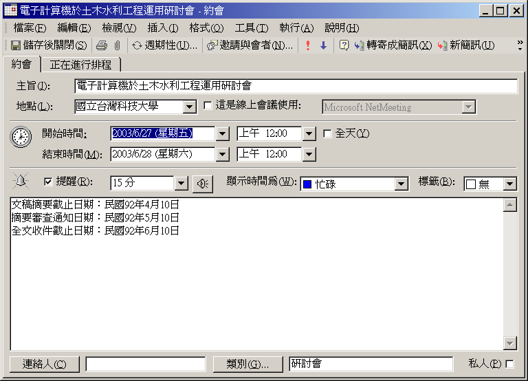 行事曆相關程式碼可參考 Microsoft Outlook Calendar 行事曆輸出模組,線上執行範例可參考水利及海洋工程學系演講與研討會行事曆