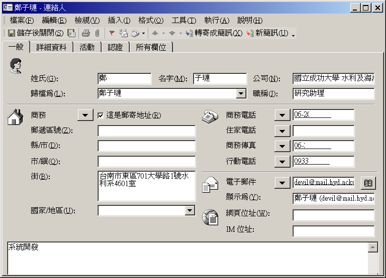 本例為連絡人,由於 IE 並不認得 vcf 格式,仍會自動跳出檔案下載畫面,選擇開啟後,自動由 Outlook 顯示,若選擇儲存後關閉,則會加入 Outlook 連絡人清單,適用於 Outlook/Outlook Express 或支援 vcf 格式之軟體。